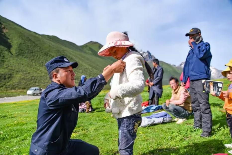 2024年7月10日,得知阿木拉小学的孩子们,将以“耍坝子”这种传统而特别的形式庆祝毕业典礼。拉巴主动联系,准备了短袖、水果等礼物,驱车60多公里,专程赶到阿木拉夏季牧场。不仅送去了物质上的礼物,更送去了警察叔叔的祝福与陪伴,见证了孩子们在草原蓝天下的欢乐“毕业”。那一刻,孩子们眼里闪烁的光芒,让他觉得“力所能及的付出特别有价值”。